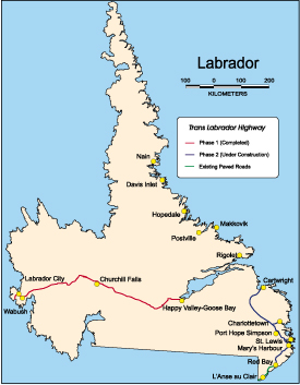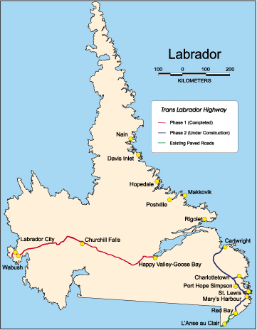 2002 - Phase II of Trans Labrador Highway completed linking Red Bay to