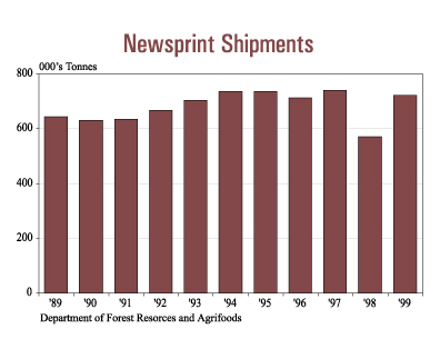Newsprint shipments totalled 722,000 tonnes in 1999, an increase of 27%