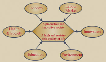 Productive and innovative societies are characterized by a high quality of life, and by cohesive economic and social policy development. Economic policies—which focus on capital investment, infrastructure development, labour market training, taxation, the environment, and research and development —create employment; provide incentives for individuals to work, save, innovate and be productive; provide funding for social programs such as education, health care, and income assistance; and provide other supports for those in need.