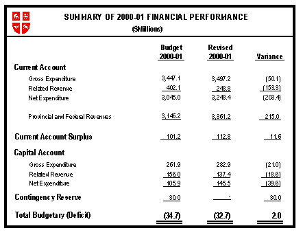 This demonstrates that we are successfully managing the affairs of the province both in the short term, but more importantly in the longer term, creating the stability necessary to promote economic growth and to sustain public services. The strategy we have utilized for several years in managing public finances is to shift revenues from years where we would have unnecessarily high surpluses to years where we would otherwise have excessively high deficits. This smoothing of the peaks and valleys of our fiscal position has been a significant factor in creating the stability the province has enjoyed over the past five years. We are employing this strategy again to ensure that the province will sustain a sound fiscal performance in 2001-02. For the year just ending, we incurred additional expenditures of $65 million including some year end investments, partly funded out of the $30 million contingency reserve, giving a net cost of $35 million. This was offset by increased current account revenues of $233.8 million, primarily additional Equalization and income tax. This could have created a surplus for 2000-01 of $164.1 million. However, if we recorded that surplus, the province would have faced a deficit of $227.3 million in the new fiscal year. The impact that this would have on services like health and education would be devastating.