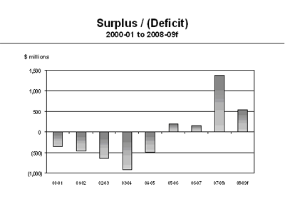Mr. Speaker, it is with great pleasure and hope for the future that I am projecting a fourth consecutive surplus in 2008-09. This is something that we would not have dared to dream when we took office in 2003 and were grappling with potential consecutive deficits in excess of $1 billion. I am pleased to report that I am forecasting a surplus this year of $544 million.