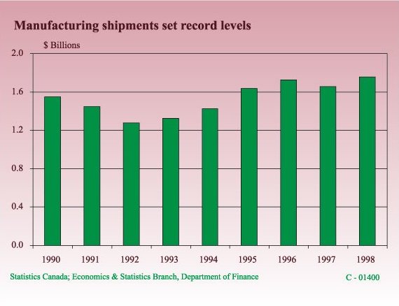 Export DrivenManufacturingThe value of manufacturing shipments increased by 6.1% in 1998 to reach a record $1.76 billion. Growth would have been stronger had it not been for a strike in the newsprint industry. Newsprint typically accounts for 25% to 35% of shipments. Manufacturing has performed well in recent years due to strong performances from its dominant components; fish, refined petroleum and paper products. Since 1992, shipments have grown at an average annual rate of 5.4%. Manufacturing employment, while dropping slightly last year, has in recent years been buoyed by a recovery in fish processing. A conducive business environment has helped foster growth and diversification in the Province's increasingly high-tech, export oriented manufacturing sector. An emerging example of this diversification is Newfoundland Bonding and Composites (NB&C) which has begun construction on a $20 million aerospace airframe manufacturing facility located in Gander. The company has secured a $13 million contract to manufacture parts such as body panels, fairings and ducting for Canada's newest search and rescue helicopter, the Cormorant. The company has hired its first employees and aims to provide 250 high-tech jobs within five years. There are a number of factors helping to enhance the business climate for manufacturers in the Province. These include the availability of world class research, training facilities that offer technical support and expertise through industrial outreach programs, and low costs (see KPMG, Section). Fiscal incentives include the lowest corporate tax rates for manufacturing and processing in the Country, exemptions from municipal tax assessment, and research and development tax credits for manufacturers. Furthermore, the combined federal-provincial Harmonized Sales Tax (HST) allows businesses full input tax credits. Also, since the inception of the EDGE program in 1995, 35 manufacturing and processing companies have obtained EDGE status.