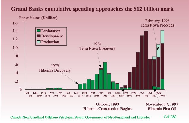 Diversifying the EconomyOil and GasHibernia Oil production reached almost 24 million barrels in 1998, the Hibernia field's first full year of operation. Production of 56,000 barrels per day from the first well set a new Canadian record. Combined capital and operating expenditures in 1998 approximated $350 million and employment averaged almost 960. Activities associated with the development and production of oil have strengthened the private sector and enabled the economy to diversify. Crude oil accounted for about 9% of the Province's exports last year. Terra Nova Development of the second largest known oil field on the Grand Banks is proceeding on schedule and on budget, with first oil expected by the end of 2000. Project investment in 1998 totalled about $670 million. Activities in the Province centered around project management and procurement, vessel design testing, preparation for subsea template and manifold fabrication, and commencement of topsides module fabrication at Bull Arm. Project employment in the Province rose from about 90 in January to almost 320 by year-end. Infrastructure The decision to proceed with Terra Nova, close on the heels of Hibernia, has accelerated the expansion of a well developed support service capability. This capability will facilitate, and make more economic, the development of local oil resources as well as position the industry for related opportunities abroad. The opening of a regional oil transshipment terminal in late 1998 was key in satisfying Hibernia's need for local transportation and storage facilities. Just two months after the official opening, it was announced that the terminal will undergo a $65 million expansion to accommodate product from Terra Nova. The provision of other value-added services, which will require further investment at the terminal, is currently under review. Exploration To date, 122 exploratory wells have been drilled resulting in 23 significant discoveries, including the newest significant discovery declaration on Amoco et al's West Bonne Bay well C-23 made last year. Seismic activity, a key component in drilling decisions, reached record levels in 1998. While declining oil prices have reduced industry cash flows and the capital budgets of most oil producers, exploration intentions for the Newfoundland offshore remain largely intact. A prime reason why the East Coast continues to attract investment is low finding cost per barrel of oil, which in the Jeanne d'Arc Basin, is about one-half of the cost in Western Canada. Three exploration rigs (one onshore and two offshore) are expected to be operating in the Province in 1999. PanCanadian is currently drilling an onshore-to-offshore well on the Port au Port Peninsula while a semi-submersible rig, the Glomar Grand Banks, is drilling the second well in its multi-well program. Glomar's first well, in the Hebron-Ben Nevis field, yielded encouraging results. A third rig, the Bill Shoemaker, is expected to arrive soon and commence drilling shortly thereafter.
