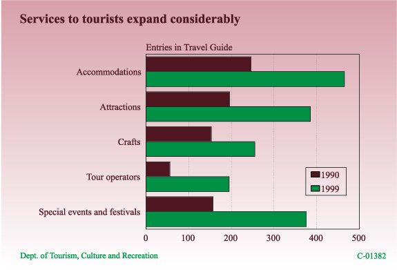 Growing An IndustryTourismPerformance Building on the interest and momentum created by the Cabot 500 Celebrations in 1997, the tourism sector experienced a solid performance in 1998. Increased tourism awareness, the depreciated Canadian dollar, and favourable summer weather were key factors behind last year's performance. Non-resident tourists, who account for between 35-40% of industry expenditures, grew by an estimated 0.7% over 1997. Several categories that are targeted for growth and development within the industry continued to post gains--tour bus passengers (9%), air charter passengers (11.6%) and St. John's cruise ship passengers (1%). Growth in Tourism Exports The past twelve years have witnessed steady growth in the non-resident tourist segment, which is the export component of tourism. Between 1987 and 1998, the number of non-resident tourists grew by an annual average rate of 2.5%. This is the result of many factors including heightened awareness due in part to the major event promotional strategy, improvements to service, and an increase in the number and quality of attractions. Tourism's Contribution Travel and tourism expenditures, resident and non-resident combined, amount to more than $500 million per year. This spending supports an estimated 2,400 businesses in the Province. Service and Infrastructure Enhancements Major investments continue to be made in the tourism sector to ensure that the attractions and services provided deliver a quality experience. Modern facilities such as the recently opened Canada Games Center in Corner Brook and the new Civic Center under construction in St. John's will deliver many new high-yield conventions to the Province. The West Coast of Newfoundland has long been recognized as a hotbed of tourism activity. Recently, plans were announced to build a $10 million four season resort facility near Deer Lake at the crossroads of the Viking Trail and the Trans Canada Highway. Inherent in the design are four star accommodation amenities and services. In line with the goals and motivational guidance provided by the Accommodation Rating Program, the number of high quality accommodations has risen steadily since its inception just seven short years ago. In particular, the number of four star facilities has taken a dramatic jump since the start of the program; between 1992 and 1998 the number of establishments boasting superior quality services grew from 2 to 10. Further improvements to transportation services for tourists are underway. The St. John's International Airport Authority is currently planning a $36 million improvement to the terminal and supporting services--work is slated to begin this Spring. Canada Winter Games Winter tourism on the West Coast received a major boost this year as Corner Brook and surrounding area hosted the Canada Winter Games. Over 3,200 athletes, coaches and managers participated in the event as well as more than 6,500 volunteers. Box office ticket sales exceeded expectations while merchandise sales (Games memorabilia) set a new record. In addition to the immediate benefits of the Games for local businesses such as hotels and restaurants, the celebrations have instilled many long-term benefits including new facilities and invaluable publicity. The Sports Network (TSN)/Réseau des Sports (RDS) was host broadcaster for the Games broadcasting over 50 hours of coverage over the two week period to sports enthusiasts across Canada. The Province claimed 19 medals (a new record) and the Jack Pelech award for displaying the most sportsmanship and spirit. |