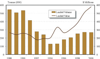 Fishery performance remained strong in 2000. While the volume of landings was down marginally from 1999, associated landed value reached a record of $580.7 million, driven by higher prices for crab and increased landings of shrimp. Production value remained at over $1 billion for the second consecutive year.