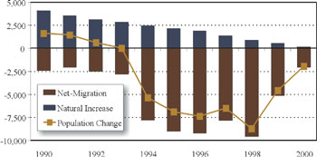 The population as of July 1, 2000 was 538,823, a decrease of about 2,000 from a year earlier. This was the smallest decline since population losses began in 1993. The population appears to be stabilizing as a result of lower net out-migration. Net out-migration slowed to 2,077 for the year (compared to 5,133 in 1999), reflecting the expanding economy and improved job prospects. The natural population increase (births less deaths) continued to decline in 2000, reflecting long-term trends. Births decreased to 4,724 (down 2.4% from 1999) while deaths increased to 4,599 (up 7.1%), resulting in a natural population increase of 125.