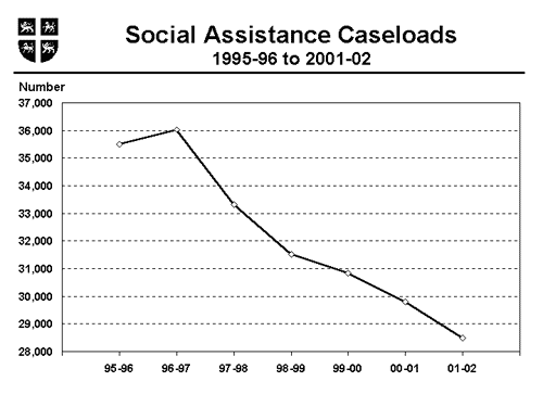 Lower Social Assistance Caseloads We have underway an ongoing series of initiatives to redesign programs that assist persons on social assistance. One thrust is to place increasing emphasis on providing employment and career supports. In recent years, we have extended drug card benefits for those returning to employment and increased the earnings exemptions while receiving social assistance. The transition to employment is supported through innovative programs such as NewfoundJobs and the Linkages Youth Employment Program, which focus on the link between social and economic development. We have achieved notable results. Over the past five years, the social assistance caseload has dropped by about 8,500, or around 23 percent. A major initiative this year will be the revamping of the Social Assistance Act, which dates from 1977. The present Act no longer reflects many of the objectives of the income support program, including easing the transition from social assistance to work. Consultations are underway to seek public input.
