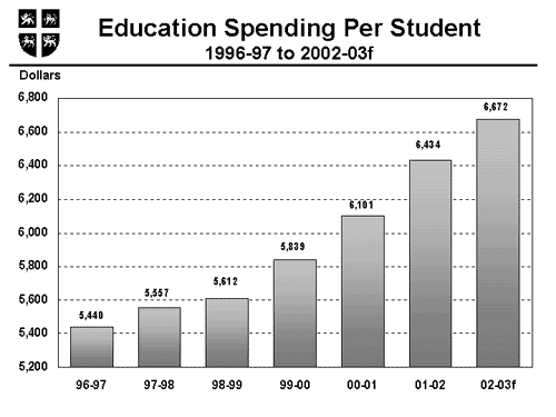 More Per Pupil in K to 12 Mr. Speaker, our initiatives continue to increase the level of spending per student in the K to 12 system. As of September 2002, school enrolment over the last five years will have declined by 17,700 students, or by 17.4 percent. Yet, over the same period our spending per student will have grown from $5,557 to $6,672, an increase of 20 percent.