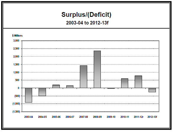 Mr. Speaker, including the revised forecast for fiscal 2011-12, the cumulative value of surpluses generated in six of the last seven years approximates $5.5 billion, bringing the province's net debt to $7.8 billion at the end of fiscal 2011-12. I will have more to say about debt in a moment.