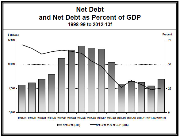 Since 2004, we have made substantial financial progress. We have decreased net debt from a high of $11.9 billion to a projected $7.8 billion at March 31, 2012, a decline of 35%. In addition, net debt as a percentage of GDP will have improved from a high of 70.2% to just 25.0% at March 31, 2013, reflecting strength in the ability of the province to support its debt.