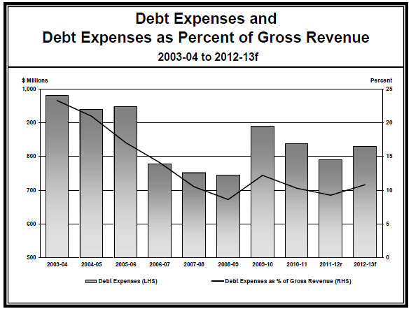 Another key measure of fiscal performance is the percentage of revenue which is consumed to service the debt. In 2004, debt expenses consumed over 23% of our gross revenues. Budget 2012 forecasts a significant improvement in this indicator, with debt expenses budgeted to be 10.8% of gross revenues, enabling us to make more productive use of each revenue dollar that is generated for the benefit of the people of this province.