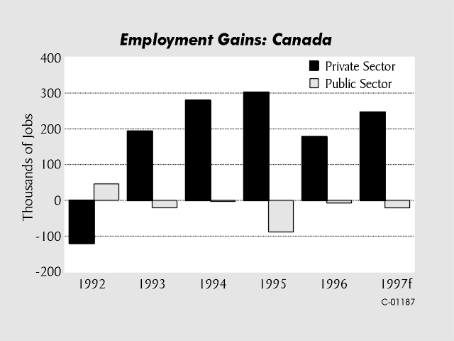 Since 1992 employment gains have been disappointing, especially when compared to past economic recoveries. In 1997 employment growth is expected to improve relative to 1996 as significant job creation in the private sector more than offsets further public sector contraction. An abundance of people ready to join the labour market as employment prospects improve means the unemployment rate will probably decline slowly.