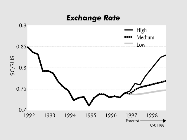 Stronger employment and personal income growth together with low interest rates and pent-up consumer demand should accelerate the domestic side of the economy in 1997. Interest rates are expected to remain low, especially relative to recent years, as low inflation, falling government deficits, and a current account surplus all help maintain and/or increase financial market confidence in Canada. These factors are also expected to put upward pressure on the dollar for the next couple of years. Increased consumer spending and further growth in housing and business investment should result in healthy and balanced GDP growth of roughly 3.0 percent.