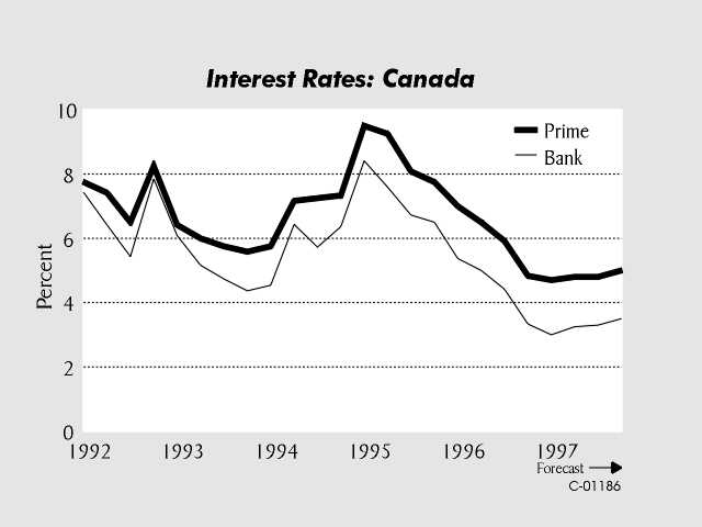 Stronger employment and personal income growth together with low interest rates and pent-up consumer demand should accelerate the domestic side of the economy in 1997. Interest rates are expected to remain low, especially relative to recent years, as low inflation, falling government deficits, and a current account surplus all help maintain and/or increase financial market confidence in Canada. These factors are also expected to put upward pressure on the dollar for the next couple of years. Increased consumer spending and further growth in housing and business investment should result in healthy and balanced GDP growth of roughly 3.0 percent.