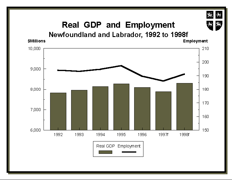 Mr. Speaker, the winding down of Hibernia construction and the continued closure of the groundfishery caused declines in real gross domestic product, employment and personal income in 1996. However, these declines were less than anticipated. For example, real GDP declined by 2.1 percent, compared to a forecast decline of 4.3 percent.