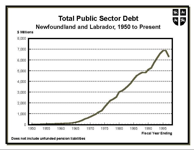 Mr. Speaker, we must stop adding to the public debt. We must also deal with the problems caused by the debt accumulated since Confederation. The Province's total debt - including direct obligations, guaranteed Crown corporation and municipal debt, as well as the unfunded liabilities in public sector pension plans - amounts to $9 billion. That works out to be $15,800 for every man, woman and child in this Province. Interest payments on our direct debt alone amount to $500 million annually. That is $900 each for every man, woman and child in the Province. Debt interest is the third largest expenditure in our Budget, after health care and education.