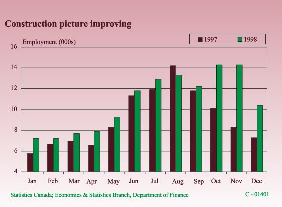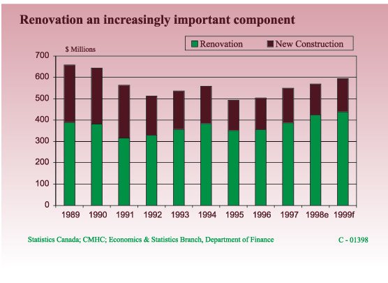 Boosted by Major ProjectsConstructionOverview The level of construction activity picked up significantly during 1998 following a period of retrenchment that succeeded completion of the Hibernia project's construction phase. The solid performance in 1998 is attributable to an array of projects in a variety of industries. Continued development of the oil industry, particularly the Terra Nova project and the transshipment facility at Whiffen Head, energized the industry last year and is expected to be a driving force again this year. Public sector road and building construction were also a major stimulus for the industry. As was the case nationally, strength in retail sales and competition among retailers spurred commercial construction and renovation. Construction employment began the year on an upward note and gained momentum, with annual average employment increasing 17.6% over 1997. Residential Investment Residential activity, a major contributor to the construction industry, was the target of increased investment again in 1998. Rising investment amid declining housing starts is consistent with a trend that has seen the emphasis in housing investment shift from new construction to renovation expenditures. Growth in the renovation component reflects the recent popularity of converting existing buildings into condominiums as well as improvement and repair of existing homes. Over the past 10 years renovation activities have increased as a share of total investment from 59% to 74%. A similar shift in the composition of housing investment has also been evident at the national level. In 1999, both new construction and renovations are forecast to rise, leading total housing investment to increase by 3.4%. An increase of 2.3% is forecast for housing starts in 1999. Activity this Year This year, the Province's construction industry is poised to receive a major boost from developments relating to the offshore oil and gas sector. Construction investment in the mining and oil industries is expected to rise substantially, accounting for the bulk of total construction investment gains. Most of the pre-production work on the Terra Nova project is set to take place in 1999. This is expected to trigger 1,300 jobs at the peak of development phase activity. Fabrication of topsides modules and a flare stack for the project's Floating Production Storage and Offloading (FPSO) vessel at the Bull Arm site could account for as many as 700 of these jobs. The recent announcement of a $65 million expansion for the transshipment facility at Whiffen Head will also create significant employment and provide an additional stimulus for the construction industry in 1999. For details of capital investment in the oil and other industries, readers are referred to a complete listing of major capital projects included at the back of this report.
