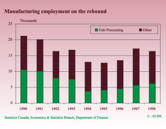 Export DrivenManufacturingThe value of manufacturing shipments increased by 6.1% in 1998 to reach a record $1.76 billion. Growth would have been stronger had it not been for a strike in the newsprint industry. Newsprint typically accounts for 25% to 35% of shipments. Manufacturing has performed well in recent years due to strong performances from its dominant components; fish, refined petroleum and paper products. Since 1992, shipments have grown at an average annual rate of 5.4%. Manufacturing employment, while dropping slightly last year, has in recent years been buoyed by a recovery in fish processing. A conducive business environment has helped foster growth and diversification in the Province's increasingly high-tech, export oriented manufacturing sector. An emerging example of this diversification is Newfoundland Bonding and Composites (NB&C) which has begun construction on a $20 million aerospace airframe manufacturing facility located in Gander. The company has secured a $13 million contract to manufacture parts such as body panels, fairings and ducting for Canada's newest search and rescue helicopter, the Cormorant. The company has hired its first employees and aims to provide 250 high-tech jobs within five years. There are a number of factors helping to enhance the business climate for manufacturers in the Province. These include the availability of world class research, training facilities that offer technical support and expertise through industrial outreach programs, and low costs (see KPMG, Section). Fiscal incentives include the lowest corporate tax rates for manufacturing and processing in the Country, exemptions from municipal tax assessment, and research and development tax credits for manufacturers. Furthermore, the combined federal-provincial Harmonized Sales Tax (HST) allows businesses full input tax credits. Also, since the inception of the EDGE program in 1995, 35 manufacturing and processing companies have obtained EDGE status.