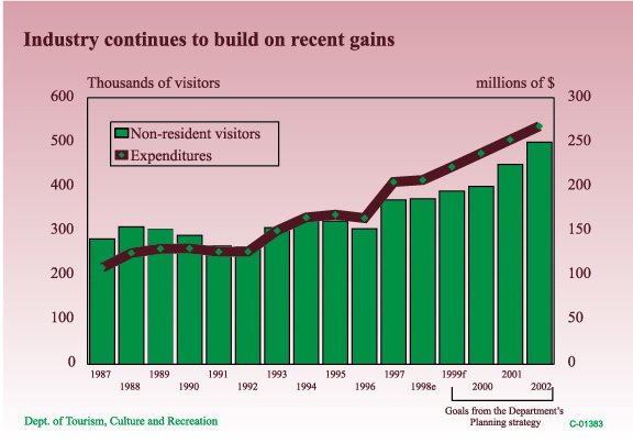 Growing An IndustryTourismPerformance Building on the interest and momentum created by the Cabot 500 Celebrations in 1997, the tourism sector experienced a solid performance in 1998. Increased tourism awareness, the depreciated Canadian dollar, and favourable summer weather were key factors behind last year's performance. Non-resident tourists, who account for between 35-40% of industry expenditures, grew by an estimated 0.7% over 1997. Several categories that are targeted for growth and development within the industry continued to post gains--tour bus passengers (9%), air charter passengers (11.6%) and St. John's cruise ship passengers (1%). Growth in Tourism Exports The past twelve years have witnessed steady growth in the non-resident tourist segment, which is the export component of tourism. Between 1987 and 1998, the number of non-resident tourists grew by an annual average rate of 2.5%. This is the result of many factors including heightened awareness due in part to the major event promotional strategy, improvements to service, and an increase in the number and quality of attractions. Tourism's Contribution Travel and tourism expenditures, resident and non-resident combined, amount to more than $500 million per year. This spending supports an estimated 2,400 businesses in the Province. Service and Infrastructure Enhancements Major investments continue to be made in the tourism sector to ensure that the attractions and services provided deliver a quality experience. Modern facilities such as the recently opened Canada Games Center in Corner Brook and the new Civic Center under construction in St. John's will deliver many new high-yield conventions to the Province. The West Coast of Newfoundland has long been recognized as a hotbed of tourism activity. Recently, plans were announced to build a $10 million four season resort facility near Deer Lake at the crossroads of the Viking Trail and the Trans Canada Highway. Inherent in the design are four star accommodation amenities and services. In line with the goals and motivational guidance provided by the Accommodation Rating Program, the number of high quality accommodations has risen steadily since its inception just seven short years ago. In particular, the number of four star facilities has taken a dramatic jump since the start of the program; between 1992 and 1998 the number of establishments boasting superior quality services grew from 2 to 10. Further improvements to transportation services for tourists are underway. The St. John's International Airport Authority is currently planning a $36 million improvement to the terminal and supporting services--work is slated to begin this Spring. Canada Winter Games Winter tourism on the West Coast received a major boost this year as Corner Brook and surrounding area hosted the Canada Winter Games. Over 3,200 athletes, coaches and managers participated in the event as well as more than 6,500 volunteers. Box office ticket sales exceeded expectations while merchandise sales (Games memorabilia) set a new record. In addition to the immediate benefits of the Games for local businesses such as hotels and restaurants, the celebrations have instilled many long-term benefits including new facilities and invaluable publicity. The Sports Network (TSN)/Réseau des Sports (RDS) was host broadcaster for the Games broadcasting over 50 hours of coverage over the two week period to sports enthusiasts across Canada. The Province claimed 19 medals (a new record) and the Jack Pelech award for displaying the most sportsmanship and spirit. |